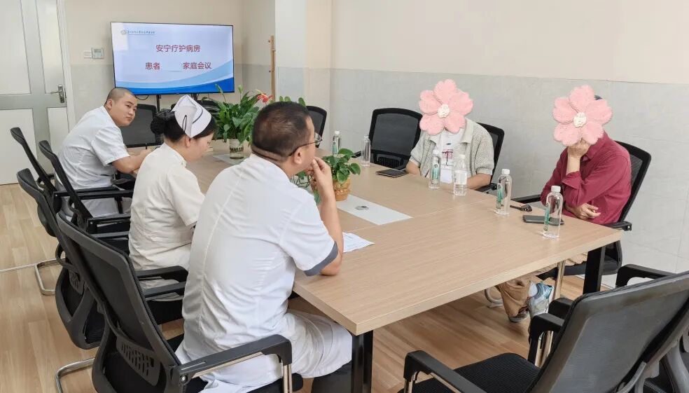 病房里没有冰冷生硬的检查单,只有围坐一圈的温情对话。会议室里,疼痛科安宁疗护区副主任李洪广、护士长袁江南、管床医生乔彦雨正与周婆婆的两个儿子面对面沟通,“我们不奢求奇迹,但求舒适;不追求延长生命,只愿她少些痛苦。”他们将医学方案转化为了最朴素的承诺。家属与医疗团队共同按下“生命优先键”——以“最大的舒适、最少的痛苦”为核心目标,不进行插管、心肺复苏等创伤性抢救,医疗团队每日动态评估周婆婆的身体症状和情绪变化等,家属及陪护全程参与翻身、喂食等基础照护。