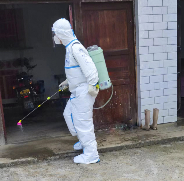 9月18日,消毒队员蔡登美正为群众家居环境消毒,“我平时没有做过背的活儿,但在抗疫一线感觉力气很大,每天都要背几百斤消毒液,每次几十斤,要轮回很多次,每天都会徒步1万多步。”蔡登美一边说一边挥动着消毒喷头。