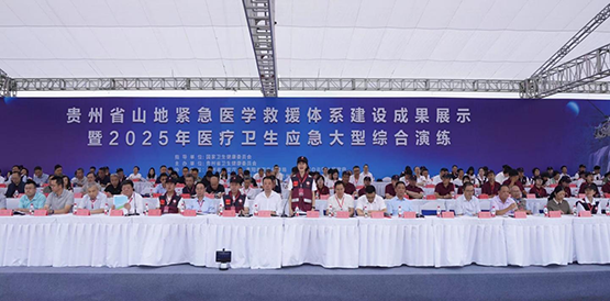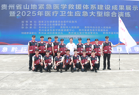 2025 年 8 月 12 日,由贵州省卫生健康委主办的“贵州省山地紧急医学救援体系建设成果展示暨 2025 年医疗卫生应急大型综合演练”在贵阳举行。遵义医科大学附属医院派出 49 名队员组成的贵州省紧急医学救援队(遵义)参加演练,并以精湛的专业技能和高效的团队协作出色完成各项任务,最终在“贵州省医疗卫生动员潜力拉动技能比武”中,凭借扎实的业务功底和顽强的拼搏精神,夺得“搬运处置”项目第一名,“防护服穿脱、双人心肺复苏、现场控制”3个项目第二名,以积分排名第一荣获“团队综合第一名”的好成绩,充分彰显遵医附院应急救援队伍高素质、高水平的综合处置和救援能力。