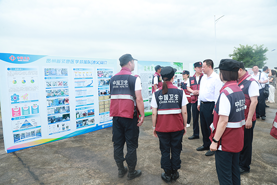 8月12日正式演练当天,国家卫生健康委医疗应急司副司长高新强来到贵州省紧急医学救援队(遵义)简介展板前听取详细介绍,了解救援队的组建情况、人员构成、装备配备及获得的成绩。高新强副司长在听取介绍后,对救援队取得的成绩给予了高度肯定。遵医附院副院长傅小云高度肯定了救援队在技能比武中荣获团队第一名的好成绩,赞扬队员们过硬的专业素质和辛苦付出,并全程观摩演练。