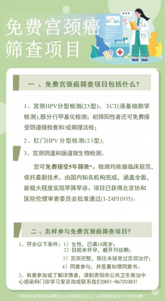 为关爱女性健康,提高宫颈癌早期诊断率,贵阳市公共卫生救治中心推出免费宫颈癌筛查项目,符合条件的女性可免费接受5年期的多项筛查。