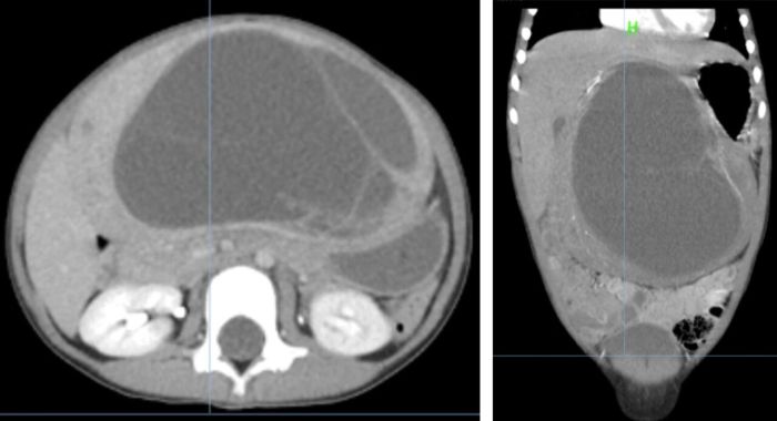 据悉,这位4岁的患儿因腹腔长了一个“足球”大小的肿瘤而备受病痛折磨,这个肿瘤不仅让孩子腹部胀痛难忍,还影响了正常的消化功能和生长发育。患儿家属经多方打听,来到了贵州医科大学第二附属医院。普外科团队在了解患儿病情后,迅速为该患儿安排了全面细致的检查。术前影像结果提示患儿中上腹腔有一巨大囊实性肿瘤,具有恶性倾向,并且已对患儿腹腔脏器形成挤压,亟须手术治疗。