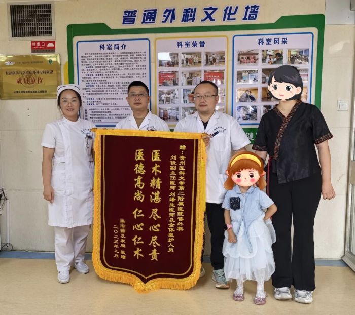 近日,一名4岁患儿及其家属满怀感激之情,将一面精心制作的锦旗送到了贵州医科大学第二附属医院普外科医护人员手中。这面锦旗不仅承载着他们对普外科医护人员深深的谢意,更是对普外科医护人员精湛医术的高度认可。