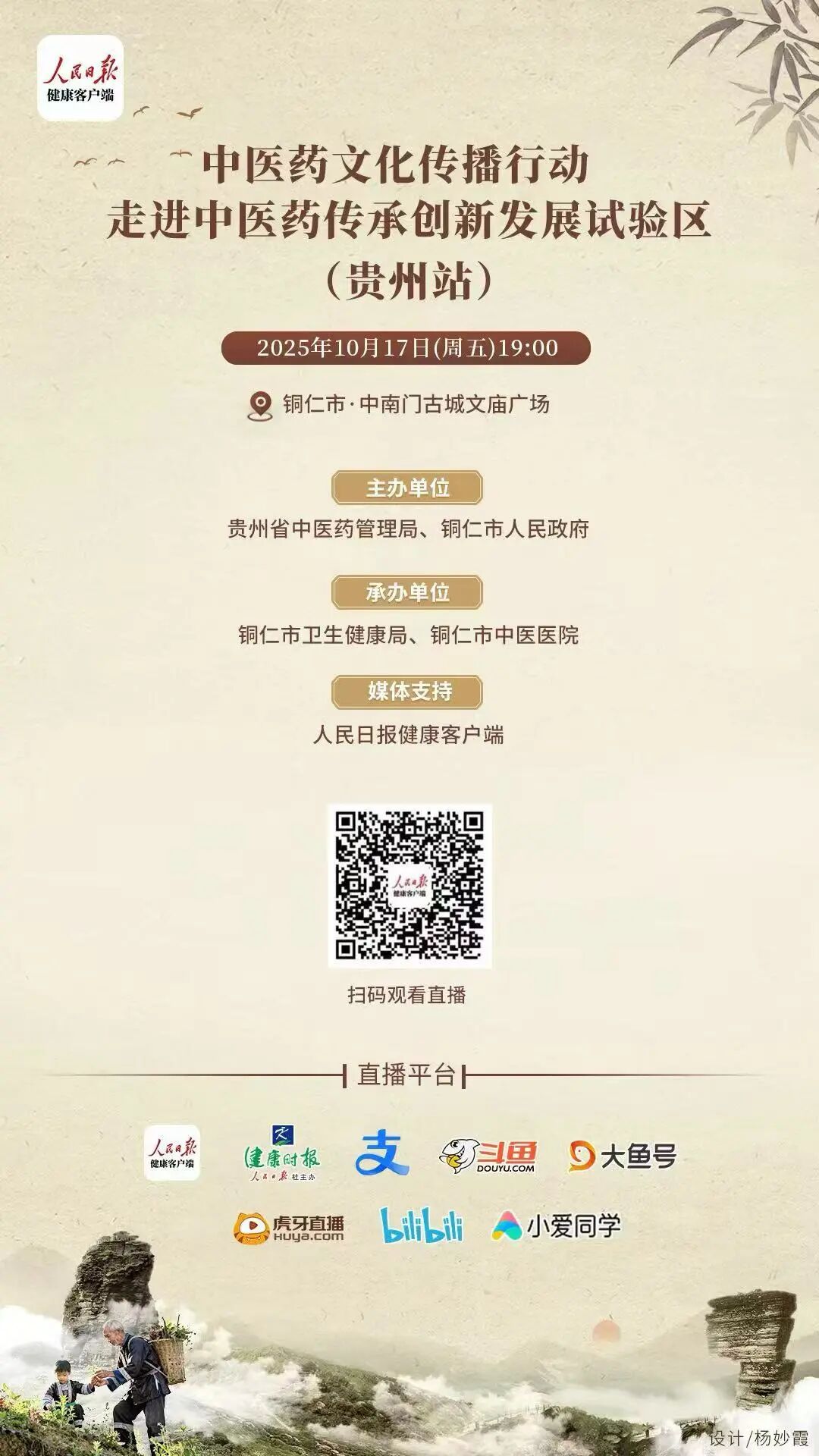 2025年10月17日(周五)19:00,由贵州省中医药管理局、铜仁市人民政府主办,铜仁市卫生健康局、铜仁市中医医院承办、人民日报健康客户端作为媒体支持的中医药文化传播行动——走进中医药传承创新发展试验区在贵州省铜仁市举行,届时将进行线上多平台同步直播。
