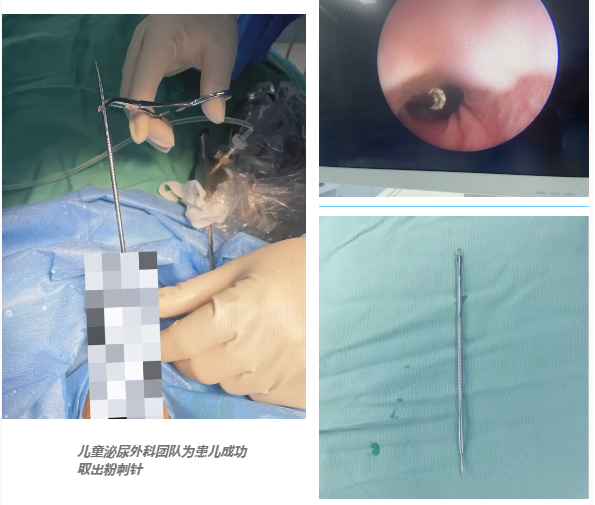 幸运的是,经过半小时的紧张手术,泌尿外科团队成功将粉刺针“无创”取出,让孩子脱离了危险。