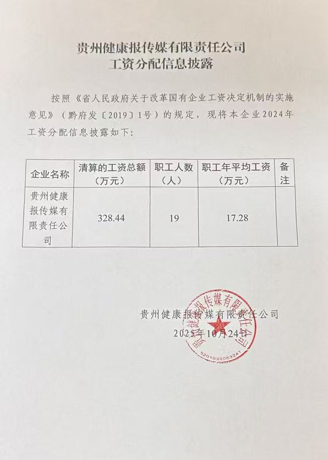 首页 > 新闻中心 > 卫生工作动态 > 正文 贵州健康报传媒有限责任公司工资分配信息披露 来源:贵州健康报 时间:2025-10-24 浏览次数: 编 辑:石 磊二 审:杜 明三 审:高学军 分享到: