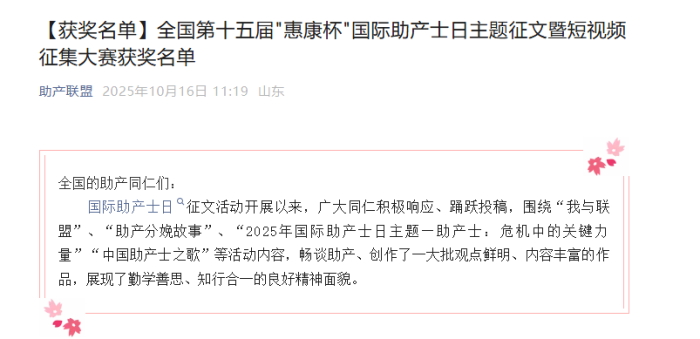 本次大赛以“生命之光,为爱启航”为主题,围绕“我与联盟”“助产分娩故事”“2025年国际助产士日主题——助产士:危机中的关键力量”等内容展开,吸引了全国广大助产同仁积极参与。活动旨在通过文字与影像,展现助产士群体的专业精神与人文情怀。龙丽的《苗乡灯火接生记》以真实感人的镜头语言,记录了助产士在苗乡基层医疗环境中的日常工作,生动呈现了她们用专业与温情守护母婴安全的动人瞬间。