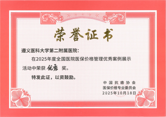 遵义医科大学第二附属医院荣获中国抗癌协会医保价格专委会“第一届全国医院医保价格质量管理优秀案例”!
