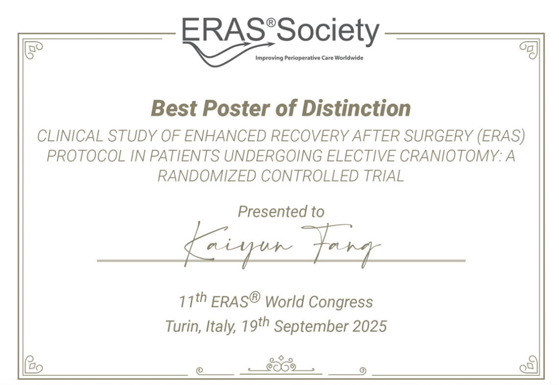 贵州省人民医院麻醉手术中心方开云老师带队一行五人组成代表团,远赴意大利参加了此次国际学术盛会,并与国际同仁进行了深入交流。此次会议贵州省人民医院麻醉手术中心共投稿5篇(3篇关于骨科ERAS,2篇关于神经外科ERAS),全部被录用,其中2篇被评为杰出壁报,并进行了交流发言,后续这些被录用的稿件将被发表于国际权威期刊《 ESPEN》。在会议结束后2025-10-02方开云老师收到国际ERAS®的贺信,其团队关于神经外科ERAS的研究:“Clinical Study Of Enhanced Recovery After Surgery (ERAS) Protocol In Patients Undergoing Elective Craniotomy: A Randomized Controlled Trial”经现场交流和专家团队评审,最终斩获“Best Poster of Distinction”殊荣,该殊荣每年只有1名,此次从贵州省人民医院被录用的稿件情况和“Best Poster of Distinction”殊荣的获得,代表贵州省人民医院ERAS不仅走出国门,更是走上了国际舞台,展现了贵州省人民医院在ERAS领域的临床实力与科研成果。