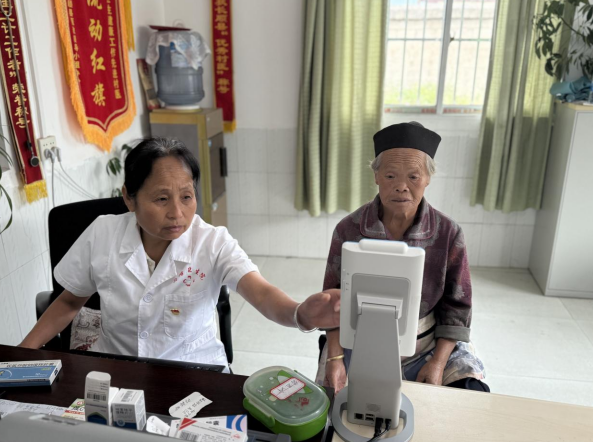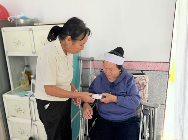“胡医生很负责,比亲人还上心。”提起胡清秀,80多岁的村民胡爷爷难掩感激。老人老伴早逝,两个儿子常年在外务工,她只能与患精神病的二儿子相依为命,家庭条件十分困难。因患有高血压,且在2024年6月膝关节骨折术后恢复不佳,行动不便的他连定期检查都成了难题。胡清秀得知情况后,主动承担起上门服务的责任,每月准时步行3公里赶到老人家里,测血压、送药品、做检查,还一遍遍叮嘱用药禁忌和护理要点。