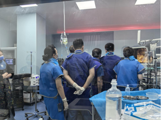 EUS-GE 对医生的操作精准度、临床经验和应急处理能力要求极高。目前国内EUS-GE 临床应用尚未普及,仅部分发达地区大型医院具备开展该技术的条件。该手术操作过程中需实时通过超声定位,避开血管、肝脏等重要脏器,同时确保吻合口牢固、通畅,避免出血、穿孔等并发症的发生。为此,消化内科内镜医生、麻醉医生及护理团队提前制定了详细的手术预案,11日下午为张大爷施行了手术。术中医护团队密切配合、精准操作,应用胃镜将超滑导丝送入狭窄远端肠管,在X线定位下送入球囊封堵远端空肠,注入造影剂使空肠近端显影,使用超声内镜在胃腔内定位,将双蘑菇头支架精准置入空肠与胃之间,仅用 40 分钟就顺利完成通道建立,全程无出血、无并发症发生。