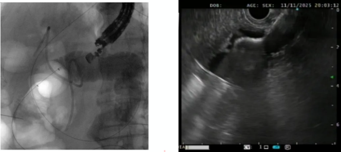 面对这一高龄、高风险病例,为破解治疗困境,遵医附院消化内科团队迅速组织多学科会诊,对患者的身体状况、肿瘤分期及梗阻程度进行全面评估。考虑到患者高龄,外科手术风险大,恢复慢,最终决定摒弃传统手术方案,选择采用目前国内外内镜领域的高难度技术 ——超声内镜引导下胃空肠吻合EUS-GE,为患者创建新的消化通路。该技术无需开腹,仅通过内镜设备,在超声的精准引导下,将特殊器械穿透胃壁与空肠壁,建立起一条直接连接胃与空肠的“捷径”,让食物绕过梗阻的十二指肠,直接进入肠道完成消化吸收,从根源上解决梗阻问题。