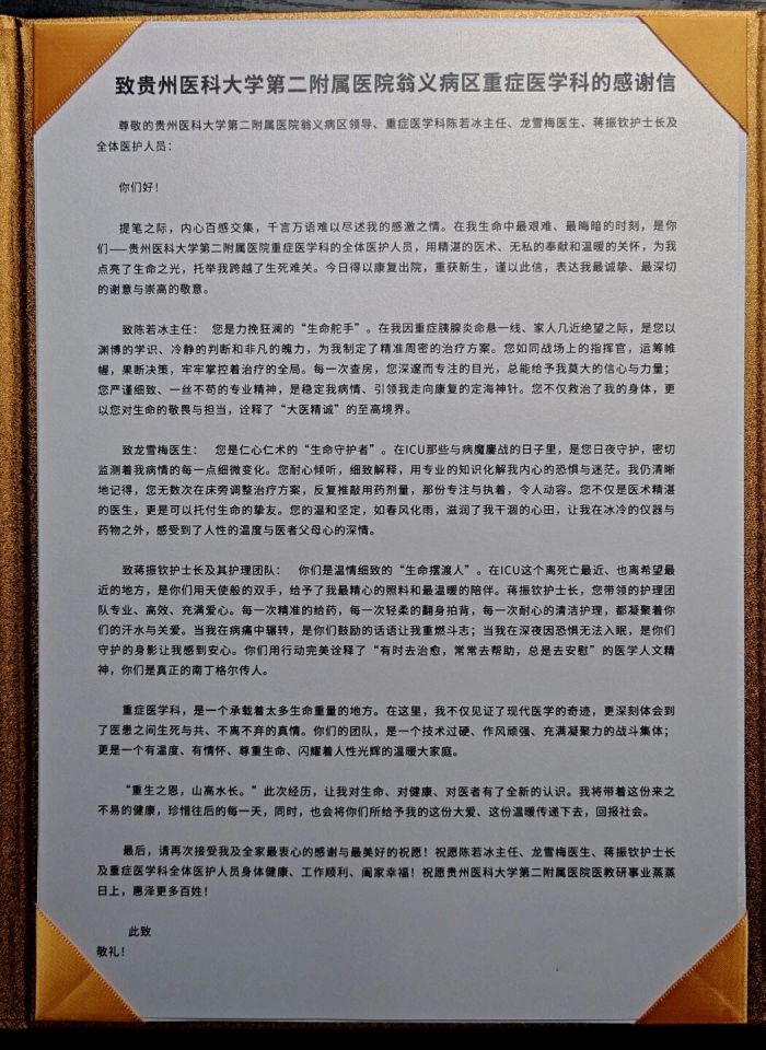 在医院里,时间常以分秒计算,尤其是在重症医学科(ICU),每一秒可能都关乎着一个生命,这是离死亡最近的地方,也是离希望最近的地方。近日,贵州医科大学第二附属医院翁义院区综合ICU,收到了一面沉甸甸的牌匾和一封感谢信,信中还原了医患之间最本真的守望与深情。