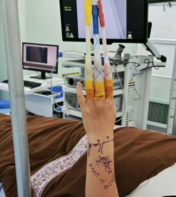 骨科主任闫飞博士详细查体及阅片后,认为患者腕关节疼痛原因为“腕关节三角纤维软骨(TFCC)损伤”,建议手术治疗。手术当天,闫飞主任医师通过3mm的小切口植入2.7mm小关节镜,将高清摄像头和精密手术器械引入腕关节内部,精准修复了患者受损的三角纤维软骨复合体,并清除了炎症组织。术后疼痛感明显减轻。