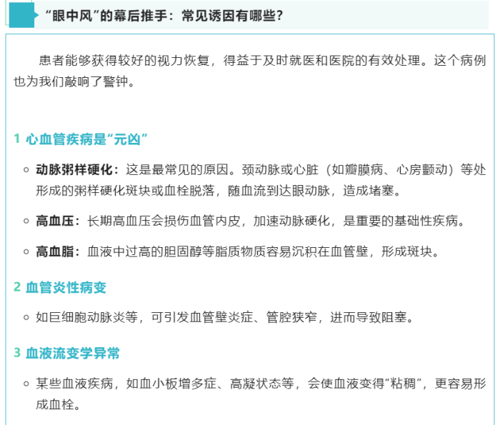 “眼中风”虽然是眼部的疾病,但它往往是全身血管问题的一个危险信号。发生“眼中风”的患者,其未来发生脑中风、心肌梗死的风险也会显著增高。因此,一旦出现单眼无痛性的突然视力下降或丧失,切勿抱有侥幸心理,务必立即就医,为自己争取宝贵的治疗时间。同时,患有以上基础疾病的人群,应积极控制原发病,定期进行眼科及全身检查,防患于未然。面对突发的视力问题,快速的反应和科学的救治是挽救光明的关键。