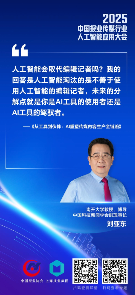 11月28日,2025中国报业传媒行业人工智能应用大会在上海举办,南开大学教授、博导,中国科技新闻学会副理事长刘亚东发表题为《从工具到伙伴:AI重塑传媒内容生产全链路》的演讲。