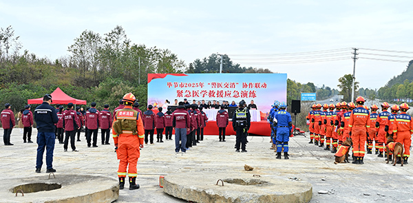 为全面提升全市在突发事件中的紧急医学救援协同处置能力,切实保障人民群众生命健康安全,11月19日至21日,毕节市2025年“警医交消”协作联动紧急医学救援应急演练在七星关区举行。此次演练由毕节市卫生健康局、毕节市应急管理局、毕节市总工会联合主办,浙江省人民医院毕节医院(毕节市第一人民医院)、贵州省紧急医学救援基地(毕节)、毕节市紧急救援中心承办,毕节市公安局、毕节市消防救援支队、毕节市蓝天救援队、毕节市疾病预防控制中心、毕节市第四人民医院等单位协办。