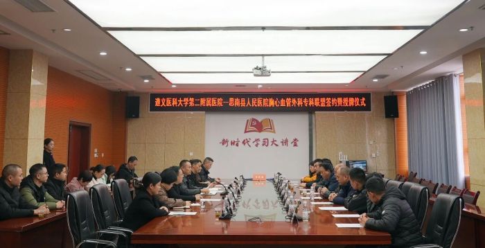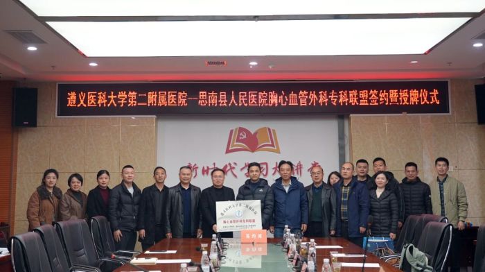 12月4日,遵义医科大学第二附属医院与思南县人民医院正式签订胸心血管外科专科联盟协议并授牌。遵义医科大学第二附属医院副院长徐刚、曾继泽,医务部副主任郑传痴,胸心血管外科主任江齐昌、护士长曾莉,思南县人民医院党委书记邓崇第,副院长杨昌军等参加签约仪式。