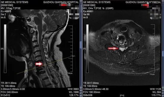 经系统检查,其病根在于颈椎椎管内有一巨大“肿物”占位,严重压迫颈部脊髓,临床诊断为脊髓型颈椎病,是巨大的颈椎间盘脱出,严重压迫脊髓导致的脊髓损伤。这种情况若未得到及时干预,出现瘫痪的风险极大。经过严谨缜密的术前评估与准备,脊柱关节科团队根据韩女士具体病情,为其实施了黔南州首例“单通道软质内镜”微创手术。