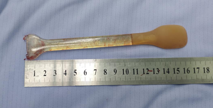 深夜的一次“甜蜜喂食”,让年轻妈妈梅女士(化名)经历了一场意想不到的医疗急救。在她熟睡之际,1岁多的儿子晃晃悠悠拿起平时喂食的长柄汤匙,模仿着平日妈妈喂自己的样子,试图将勺子放入妈妈口中。半梦半醒间的梅女士无意识吞咽,竟将这把长达17厘米的汤匙吞入胃中。很快出现胃部胀痛,在家人的陪同下,她紧急前往贵州省职工医院就诊。