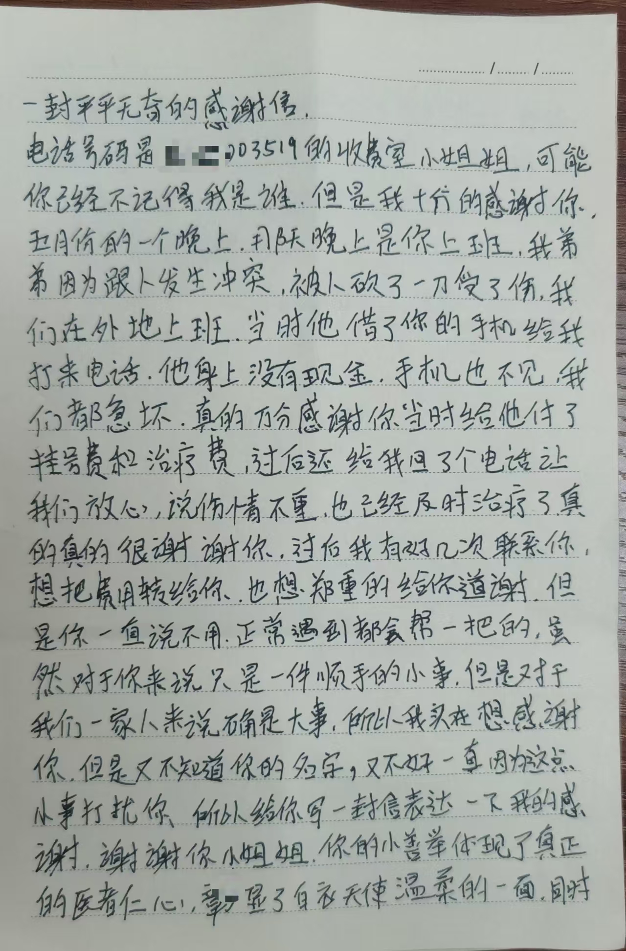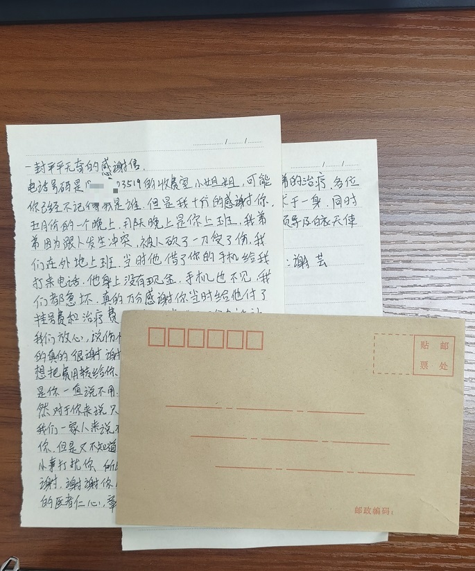 信是一名在外地工作、名叫谢芸的女子写来的。信的开头就写下了医院挂号室一名工作人员的电话号码,说今年5月的一个晚上,她弟弟因和别人发生冲突而受伤,一个人来到医院,在手机遗失也没有钱的情况下,挂号室的当班的小姐姐借了手机给其弟弟打了电话,还替其弟弟交了挂号费和治疗费。处理完后,挂号室的小姐姐还给她回电话说伤情不重,已经处理好了,叫她放心。事后,她曾多次联系挂号室的无名小姐姐,希望把弟弟的挂号费及治疗费转给她,并郑重说声谢谢。但是挂号室的小姐姐一直说不用,正常人遇到都会帮一把的。