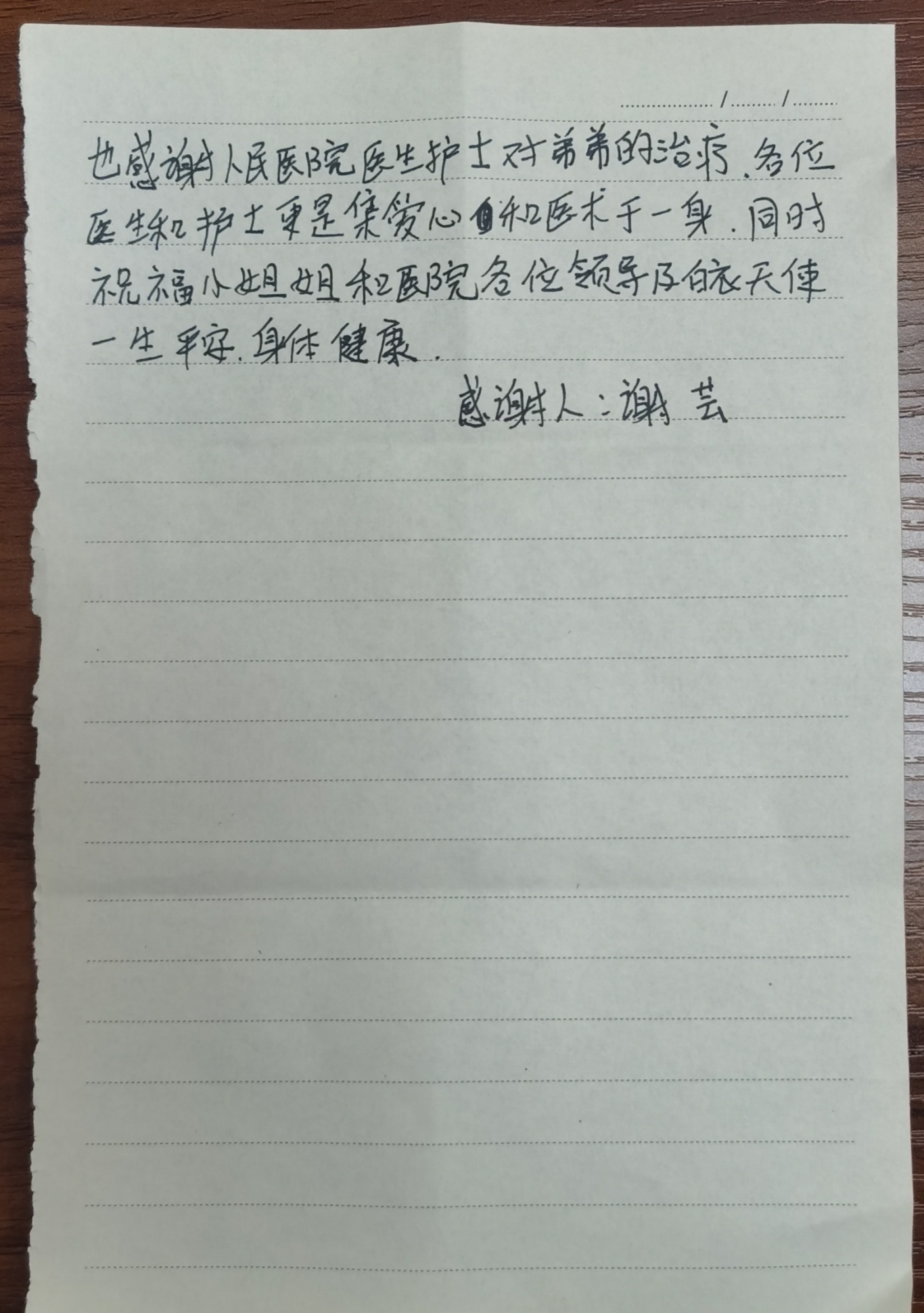 平平常常的一件小事,对于受帮助的谢芸弟弟及一家人来说却是大事,她们真心想感谢医院挂号室的这名工作人员,但又不知道她的名字,然后写了一封感谢信请当地的跑跑小哥送到医院,表达她们一家人的感谢之情。
