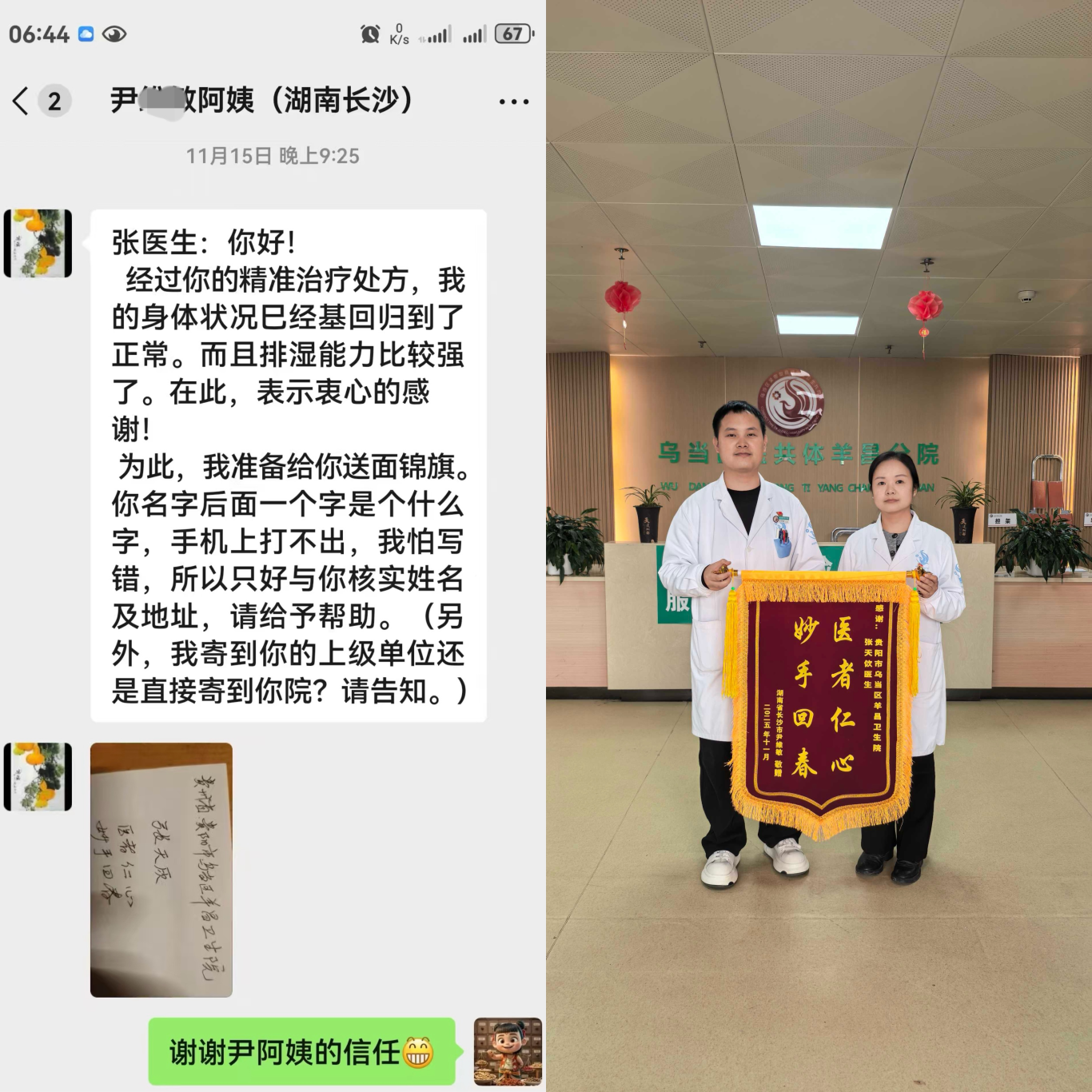 数月前,尹阿姨到乌当区羊昌镇旅游时,多年的老毛病突然复发,她随即前往羊昌镇卫生院就诊,并由张天佽医生接诊诊治。治疗期间,张医生专业的医疗技术和耐心细致的服务态度,让尹阿姨倍感安心。身体逐渐好转返回长沙后,尹阿姨先是通过微信向张医生表达感激:“经过你的精准治疗,我的身体状况已基本恢复正常,排湿能力也明显改善,在此向你表示衷心的感谢!”随后,她又专门制作锦旗,用快递将这份心意送到了卫生院。