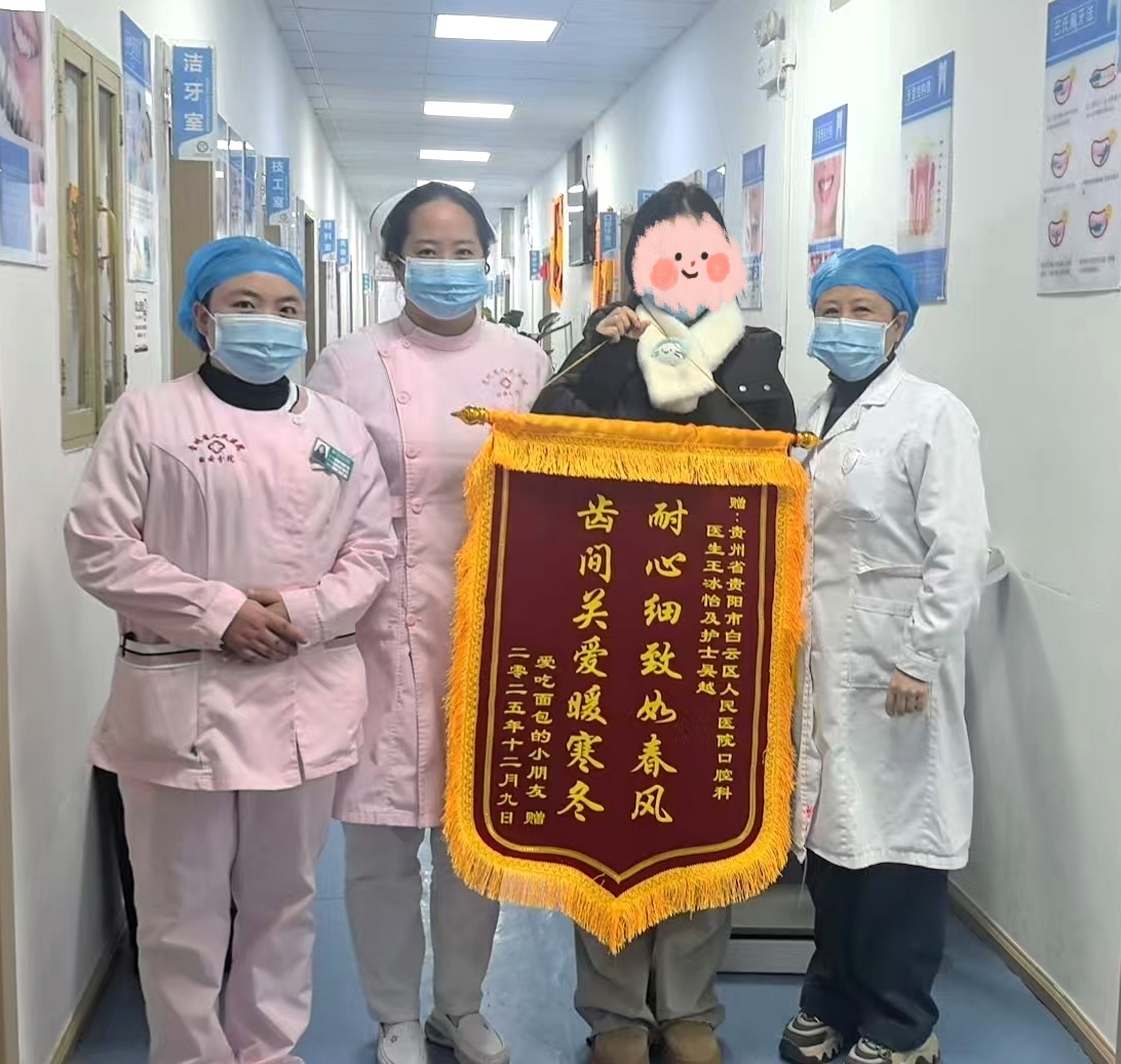“齿间关爱暖寒冬,耐心细致沐春风”。近日,一面烫金锦旗在贵阳市白云区人民医院口腔科走廊里格外醒目,送旗的患者笑意舒展,而接诊的王医生与护士小吴,正是这面锦旗背后“痛去齿安”故事的主角。