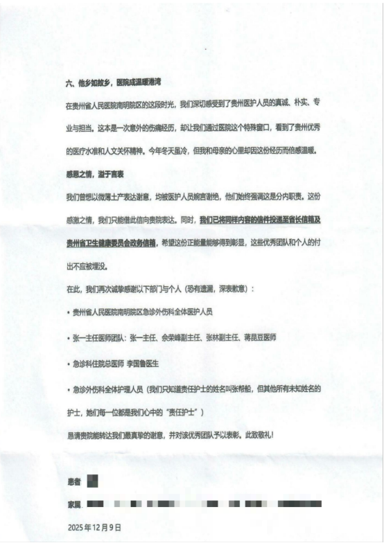来信中,患者家属特别向贵州省人民医院南明院区急诊外伤科全体医护人员、张一医生、急诊科住院总医师李国鲁以及急诊外伤科护理团队表达了诚挚感谢,并希望能对这一优秀集体给予肯定和表彰。