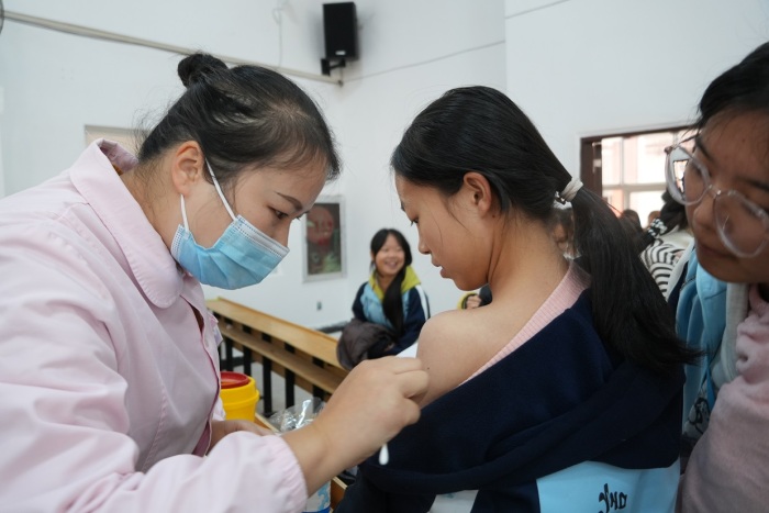 接种时,医护人员严格依照疫苗接种规范,仔细核对信息、规范操作流程,详细询问接种对象的健康状况,并向学生及陪同老师普及HPV疫苗接种的重要意义,讲解HPV疫苗接种的注意事项及相关健康知识,引导学生及老师正确认识疫苗在宫颈癌预防中的重要作用。