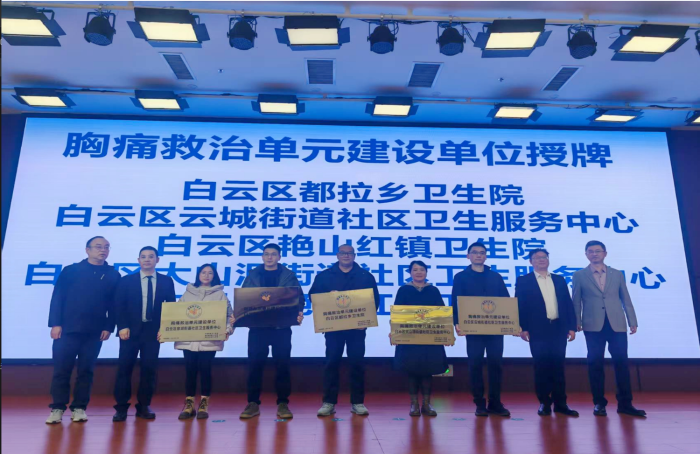 参会的领导及各位专家,共同为白云区、息烽县、修文县、开阳县15家乡镇卫生院及街道社区服务中心进行“胸痛救治单元建设单位”授牌。