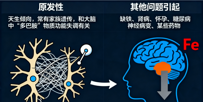1. 原发性(天生倾向):常有家族遗传,和大脑中一种叫 “多巴胺” 的物质功能失调有关,多巴胺就像“运动指挥官”,它乱了,腿就“乱动”。