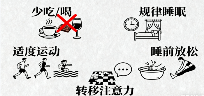 ②规律睡眠:固定时间睡和起,营造安静、黑暗的睡眠环境;