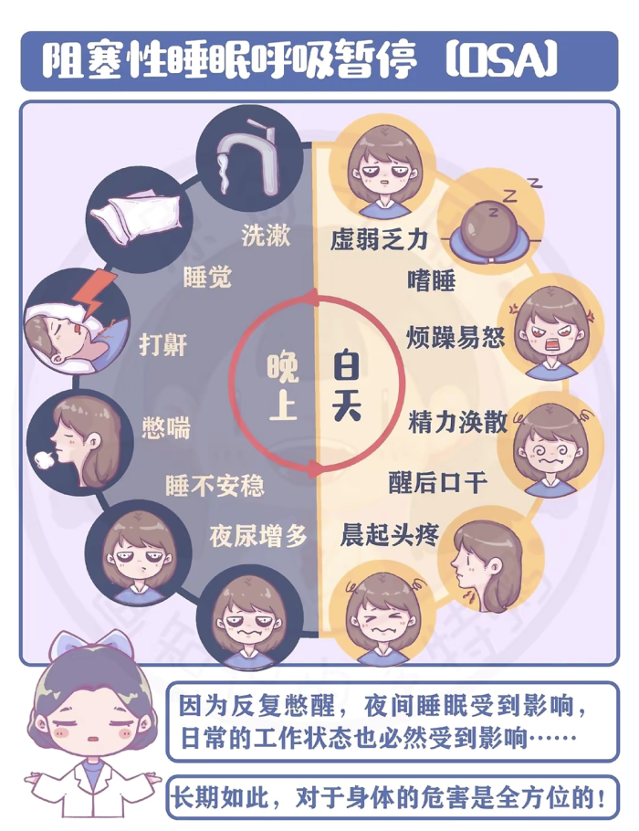 阻塞型睡眠呼吸暂停(OSA)指的是睡眠时上气道反复塌陷、阻塞,引起呼吸暂停和低通气,导致身体因缺氧而反复憋醒,干扰睡眠,长期可导致多系统器官功能受损。简单说,就是睡着后喉咙被软组织堵住,呼吸暂停≥10秒,空气进不来,血氧下降,大脑被迫把你“重启”一次,一晚几十次“断气”,你却在梦里毫无记忆。