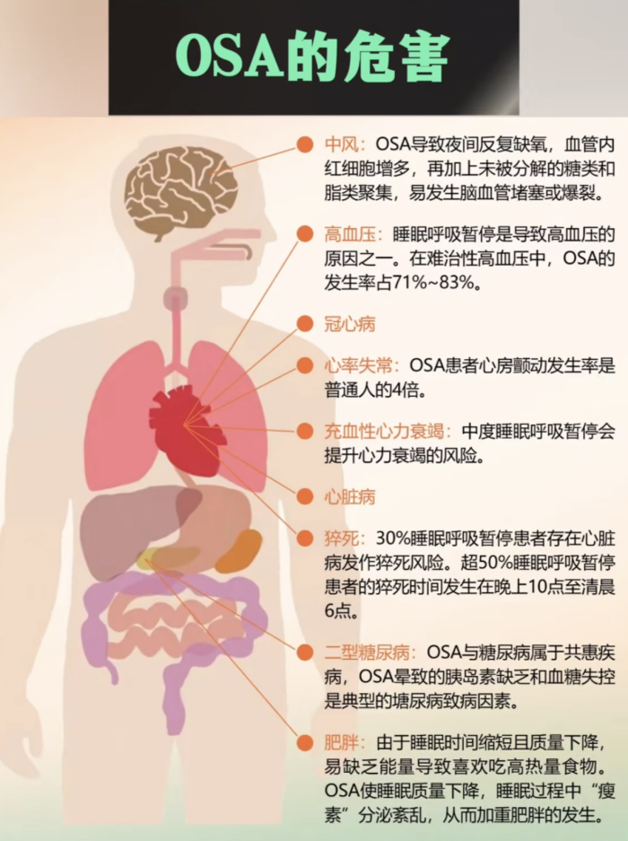 睡眠呼吸暂停是被严重低估的慢性病,它的危害很多:对心脑血管来说,它就像个“定时炸弹”,得高血压的风险比普通人高三四倍,因为夜里反复缺氧、憋醒,身体会分泌让血管收缩的激素,血压就降不下来,还容易引发心梗、脑梗,因为缺氧会伤血管、促血栓。