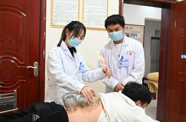 莫明仙(左一)为患者拔火罐
