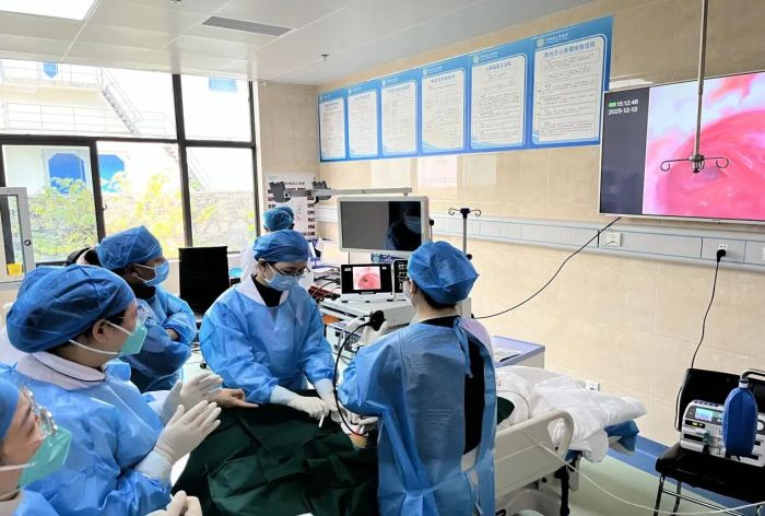 12月13日,思南县人民医院呼吸与危重症医学科在浙江大学医学院附属邵逸夫医院呼吸与危重症医学科张冀松博士的指导下,首次完成“支气管镜下肿瘤切除术及内科胸腔镜检查”。该技术通过支气管镜引导,将特制电圈套器精准置入患者气道肿瘤部位,通过电圈套器将气道肿瘤切割,快速解除呼吸道梗阻,成功救治一名因支气管肺癌引起呼吸困难的患者。标志着思南县人民医院呼吸介入诊疗水平迈入新高度,填补了院内气道肿瘤微创介入治疗的空白。