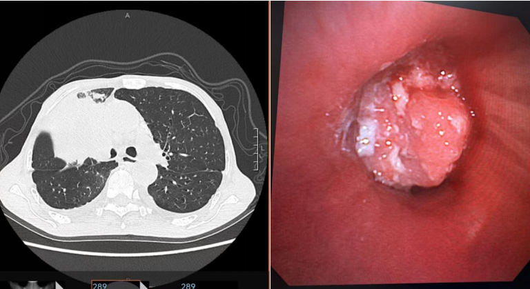 患者王先生(化名),79岁,因“咳嗽、咳痰及气促2月”入院。影像学检查显示右肺上叶支气管占位,右肺上叶阻塞,右肺通气功能严重受阻,活动后明显气促。气管镜下见右主支气管远端被肿瘤几乎完全阻塞,短期全身静脉化疗不能及时解除患者呼吸困难症状,经科室讨论后,建议先行支气管镜下肿瘤切除术开通患者气道,再行静脉化疗。