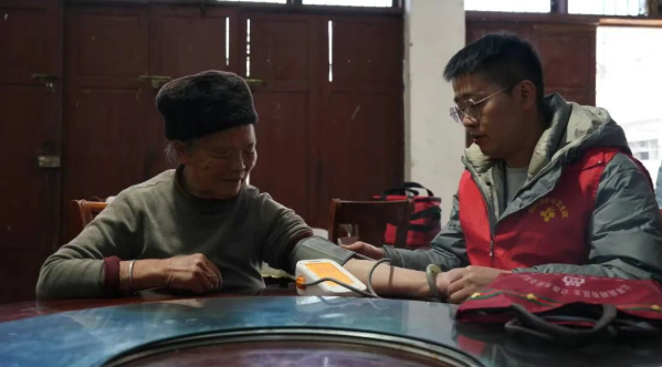 在丹寨县扬武镇朱砂村,家庭健康服务团队的医护人员携血压计、血糖仪、健康档案册等器材走村入户,敲开独居老人陈通智的家门。他们为老人测血压、血糖,用方言细致询问饮食与用药情况,还耐心叮嘱用药禁忌。