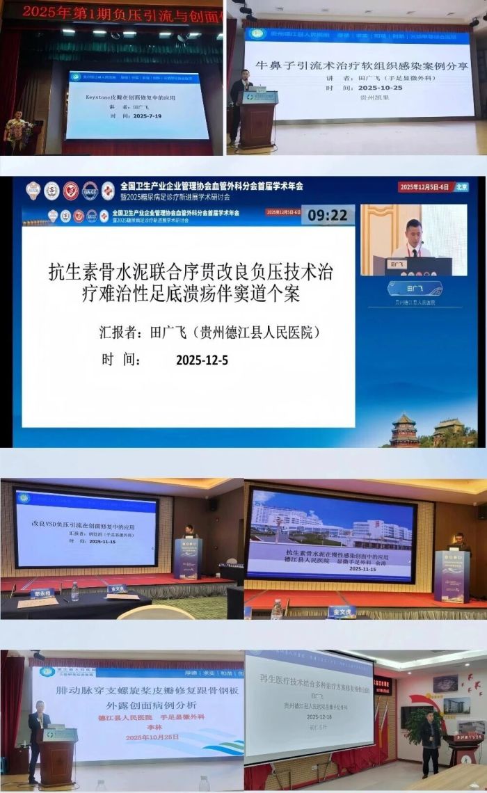 7月,田广飞医生远赴广东佛山,参加 “负压引流与创面修复学术沙龙”,与国内顶尖专家同台论道,深入切磋。10月,田广飞带着《“牛鼻子引流术”治疗软组织感染案例分享》专题报告去到贵州凯里,将德江县人民医院成熟的临床经验与同行无私分享,获得一致好评。12月,他再度启程,奔赴北京参加“全国卫生产业企业管理协会血管外科分会首届学术年会暨2025糖尿病足诊疗新进展学术研讨会”。12月,铜仁石阡,参与地区间的学术交流。