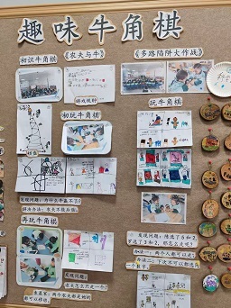 园内的过道与公共区域也成为文化传承的延伸阵地。课题组精心打造“北侗牛角棋文化长廊”,通过图文展板生动呈现棋类的历史渊源、不同流派的规则图解,更展示了幼儿对弈的精彩瞬间,让每一面墙都成为“会说话的文化课堂”;同时,在过道地面绘制大型牛角棋棋盘,充分利用幼儿入园、离园、户外活动等碎片化时间组织小组对弈,让公共空间“活”起来,实现文化学习与游戏体验的无缝衔接。