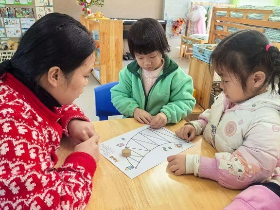 北侗牛角棋是流传于当地的传统民间益智游戏,棋盘形似牛角,规则简洁却蕴含精妙逻辑,承载着北侗先民的生活智慧与竞技乐趣。为让这一传统文化瑰宝适配幼儿教育场景,课题组精准把握3-6岁幼儿身心发展规律,将牛角棋游戏创新性融入集体教学环节,构建起分层递进的教学体系。教学中,教师采用直观演示法现场实操讲解棋规,让幼儿在近距离观察与互动中感受传统文化的独特魅力;针对小、中、大班幼儿的认知差异,量身定制教学方案:小班侧重棋具认知与简单规则感知,通过触摸、辨认棋盘与棋子建立初步认知;中班强化落子逻辑与同伴互动,在对弈中学习沟通协作;大班则融入策略思考与竞赛元素,培养幼儿的逻辑思维与抗挫能力,全方位激发幼儿的学习兴趣与探索热情。