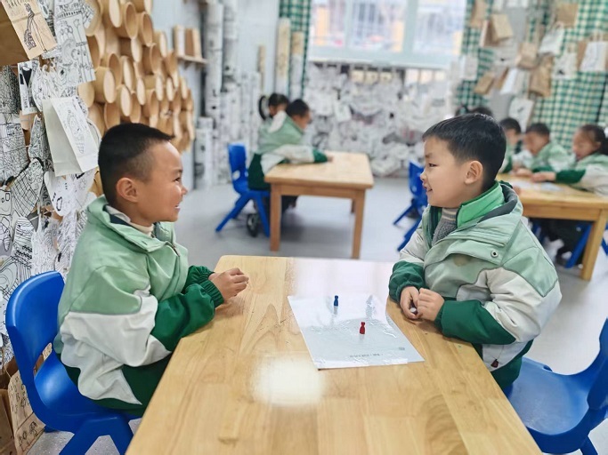 除集体教学外,课题组更推动牛角棋游戏与园内各区域活动深度融合,打造全方位的文化浸润场景。在室内区域,益智区投放了幼儿可自主操作的自制牛角棋棋盘、自然材料棋子及规则图解卡,孩子们自主组队对弈,在沉浸式博弈中锤炼逻辑思维、树立规则意识;美工区里,幼儿运用黏土、彩纸等多元材料,亲手设计制作专属棋盘与棋子,让动手实践与文化认知有机结合,赋予传统棋类新的童趣活力;语言区以“牛角棋故事分享会”为载体,鼓励孩子们大胆讲述对弈中的趣事与心得,在表达与倾听中提升语言组织能力与共情能力。