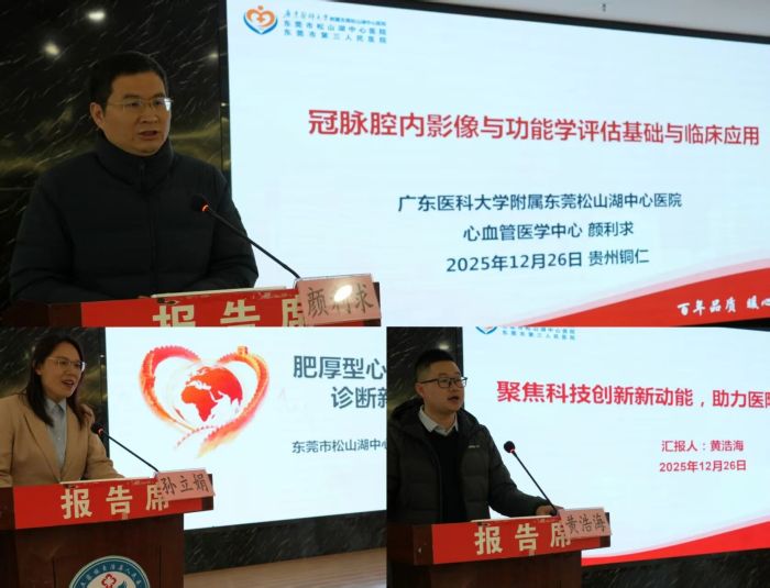 当日下午,东莞市松山湖中心医院心血管内科主任颜利求、超声科主任孙立娟、科教科副主任黄浩海分别围绕冠脉腔内影像与功能学评估、肥厚性心肌病超声诊断新进展、科技创新与医院高质量发展等主题开展学术讲座。神经内科主任卢志刚参与指导了“卒中中心”疑难病例讨论。专家们结合丰富临床经验进行分享,现场交流积极、学习氛围浓厚。讲座后,各位专家深入相关科室开展教学查房与工作指导,助力临床与学科建设。