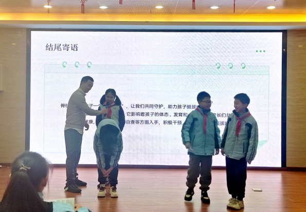 “我发现他的肩膀一边高一边低,是不是要提醒他改姿势?”现场,学生举着手说道,医生当即给予肯定,并现场示范正确的坐姿、站姿,强调“一尺一拳一寸”的读写原则,眼睛离书本一尺,胸口离书桌一拳,手指离笔尖一寸。同时推荐跳绳、游泳、小燕飞等护脊运动。中医整脊科团队带来的"简易护脊操"更是引发全场参与热潮,通过拉伸、扩胸等简单动作,帮助学生缓解颈肩腰背疲劳,将健康理念转化为实用技能。