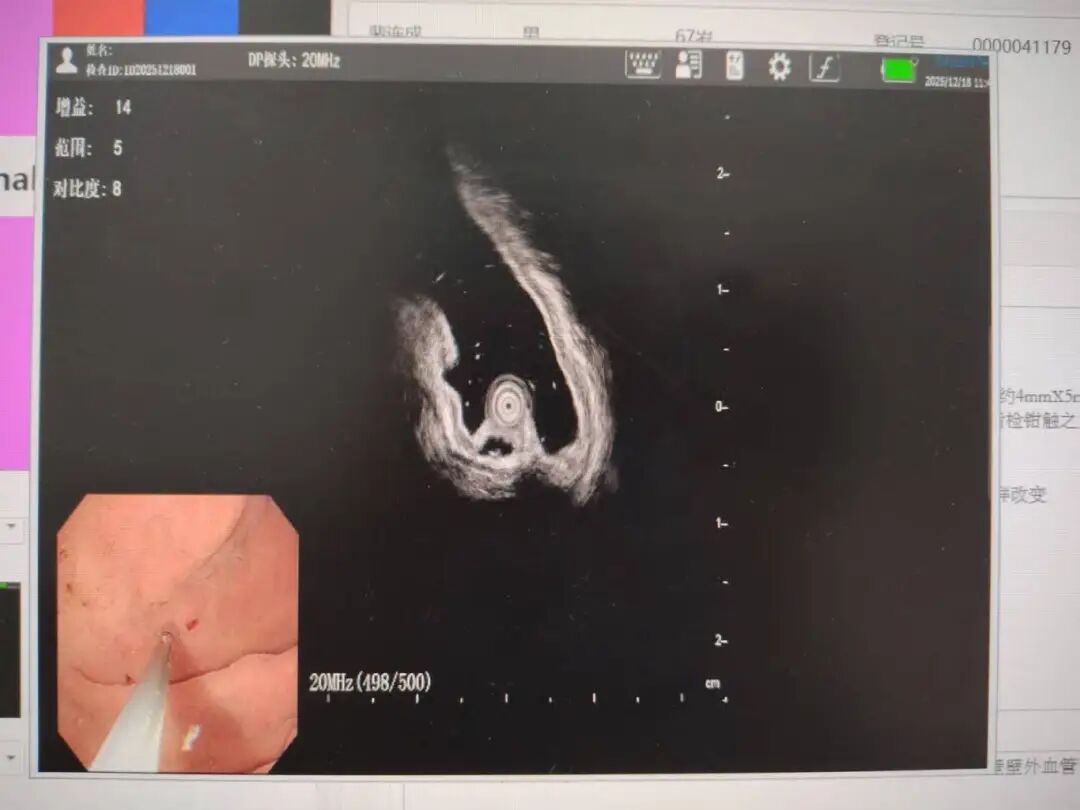 检查当日,刘添文亲自操作检查。这根看似普通的内镜,尖端实则集成了高清摄像头和高频超声探头,经由口腔缓缓进入裴先生体内。屏幕上,消化道的黏膜层清晰可见,当内镜抵达胃底隆起区域附近时,刘添文启动了超声模式。画面瞬间从表面形态切换到深层组织的断面结构,像一把精准的“解剖刀”,一层层“切开”组织,清晰展现深层构造。