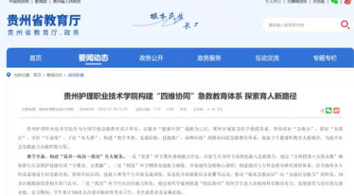 贵州护理职业技术学院“四维协同”急救教育体系获贵州省教育厅网站宣传