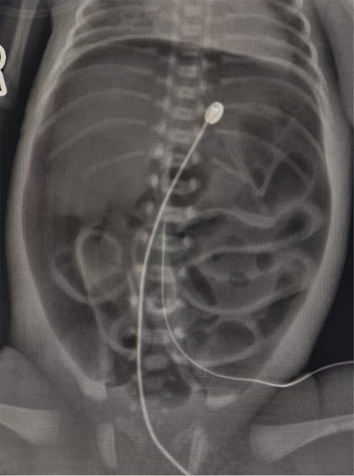 这名早产宝宝因胎龄不足,出生后便转入新生儿重症监护室(NICU)接受精细化监护与治疗,医护人员日夜守护,全力为其脆弱的生命保驾护航。然而,平静在出生后第3天被打破,医护人员发现患儿腹部异常膨隆,张力极高,情况危急。