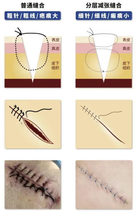超减张美容缝合的核心原理是通过四层递进式减张实现精准修复:深筋膜层缝合、皮下减张缝合、真皮层精细对合、表皮无张力闭合。这种“由内而外”的张力分散体系,可将伤口承受的拉力降低80%以上。临床数据显示,超减张缝合的疤痕宽度平均仅0.2mm,是传统缝合的1/5。