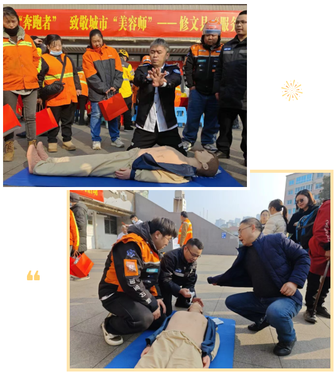 1月15日,为提升高危职业群体应急救护能力,修文县总工会联合修文县人民医院开展情系户外“奔跑者”致敬城市“美容师”—修文县“服务户外劳动者日”慰问活动暨“医疗急救宣传日”义诊活动。